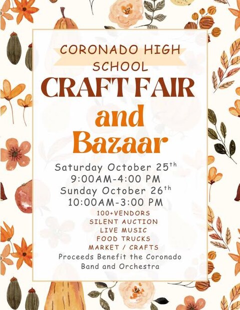 The Coronado Craft Fair and Bazaar is the largest fundraiser for the instrumental programs at Coronado High School. More than 100 vendors, Food Booths and the perfect time to start your holiday shopping!